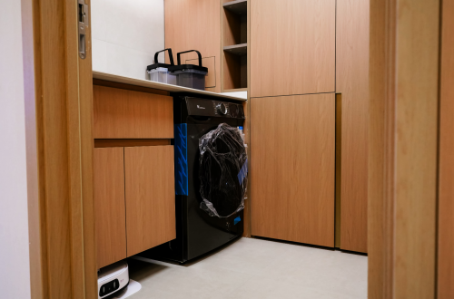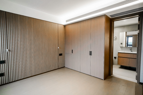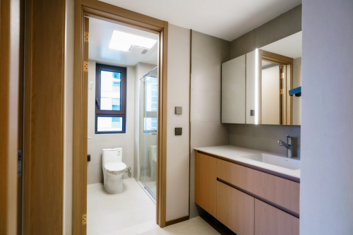 “这个小夜灯起夜不刺眼,不用摸黑找开关”“有独立的清洁工具收纳处,不用担心收纳空间高度不够”“卫浴美妆柜分层设计,护肤品不用堆台面上”。遇到业主问“以后想换书桌,墙面颜色搭不搭”,工作人员也能笑着回答“自然风格打底,配任何风格都不违和的”。
